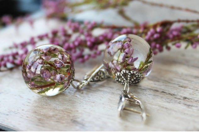 Discover the magic of nature with these handmade resin earrings featuring real pink Heather flowers preserved in crystal-clear epoxy resin. Each tiny flower is encased in a delicate sphere, creating a whimsical and unique accessory that looks unusual and magical.