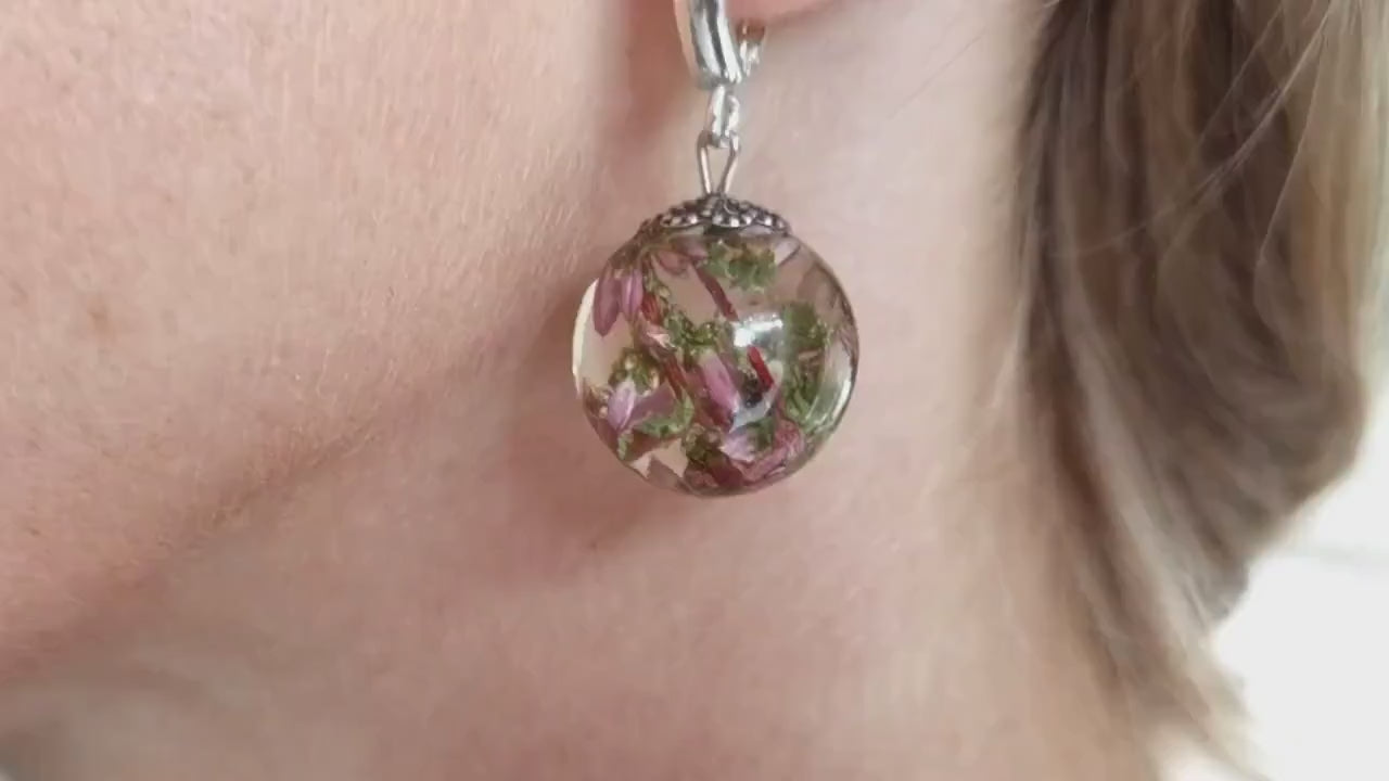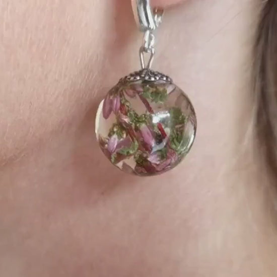 Discover the magic of nature with these handmade resin earrings featuring real pink Heather flowers preserved in crystal-clear epoxy resin. Each tiny flower is encased in a delicate sphere, creating a whimsical and unique accessory that looks unusual and magical.